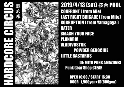 | 2019/4/13(Sat) | @東京 桜台POOL [HARDCORE CIRCUS番外編] Op/16:00 St/16:30 Ticket:\1,900 (+D) ■CONFRONT ■LAST RIGHT BRIGADE ■HATER ■SMASH YOUR FACE ■PLANARIA ■VLADIVOSTOK POWER GENOCIDE ■LITTLE BASTARDS ■KORRUPTION -DJ-MITO PUNK AMAZONES -PUNK GEAR SHOP-CLEAR ![]() |