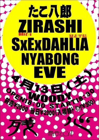 | 2019/4/13(Sat) | @新潟 WODDY [烏合とCn!プレゼンツ-残心-] Op/18:00 St/18:30 Adv.\2,000/Day.\2,300 (+1D) ■たこ八郎 ■SxExDAHLIA ■NYABONG ■EVE ■ZIRASHI ![]() |