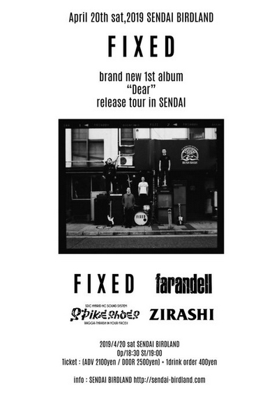 | 2019/4/20(Sat) | @宮城 SENDAI BIRDLAND FIXED “Dear” Release Tour in SENDAI Op/18:30 St/19:00 Adv.\2,100/Day.\2,500 (+1D) ■FIXED ■farandell ■spike shoes ■ZIRASHI ![]() |