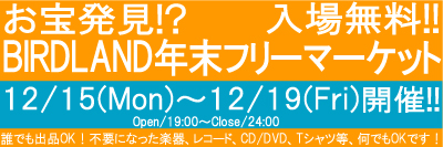 | 12/15(月) | [お宝発見!? BIRDLAND年末フリーマーケット]Open/19:00〜Close/24:00 入場無料年末恒例のフリーマーケットを12/15〜12/19の期間中開催致します! 誰でも出品OK!不要になった楽器、CD/DVD、レコード、Tシャツ等、何でも出品OKです!