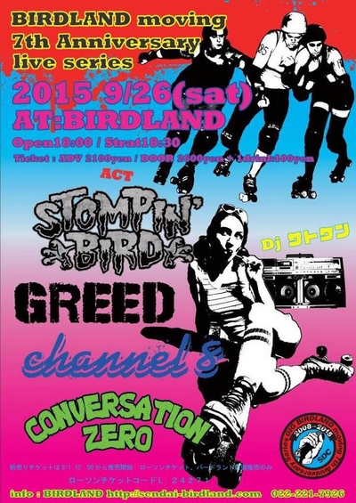 | 9/26(土) | [BIRDLAND moving 7th ANNIVERSARY live series vol.5]Op/18:00 St/18:30 Ticket:前売\2,100/当日\2,600 (Drink代別途\400)[act] STOMPIN' BIRD (横浜) / CONVERSATION ZERO / channel8 / GREED [DJ]サトケン